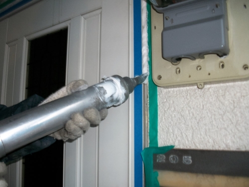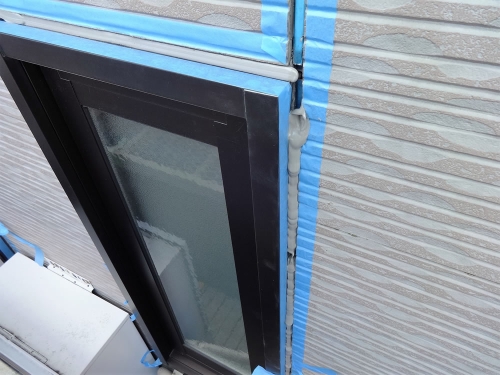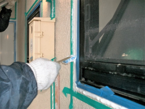 たっぷりと2液性コーキング材を目地・サッシ回りなどに充填していきます。