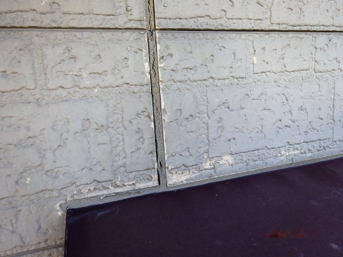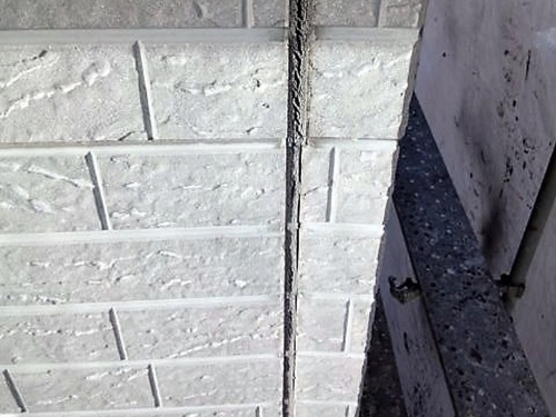 | サイディング壁の最大の注視点は、継目、サッシ廻りのコーキングだと思います。 コーキングは材料にもよりますが寿命は約10年と言われており、ゴム状だったものが固くなり下記写真の様な状態になってきます。 コーキングは雨水の侵入を防ぐ大切な部分です。 壁表面がきれいでも雨漏りしていたら建物にはよくありません。 コーキング部分の劣化具合でメンテナンスの時期が決まると言ってもいいでしょう。 |