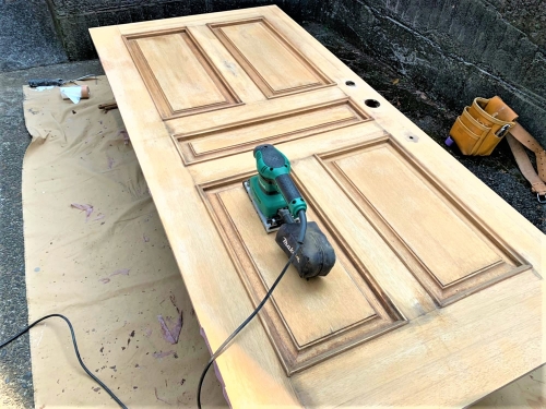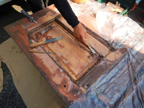| アク洗い後よく乾燥させます。薬品を使うことによって「木」がささくれたり、毛羽立ちが起こる部分が出てきます。一度全体的にペーパー掛けを行います。 | |||
