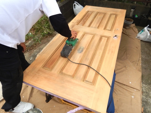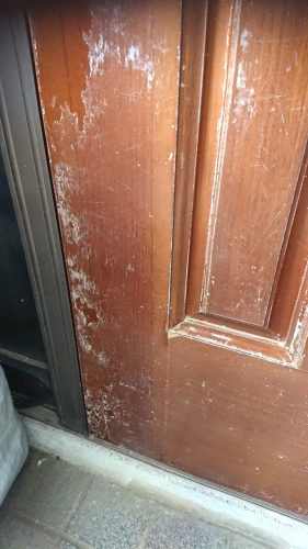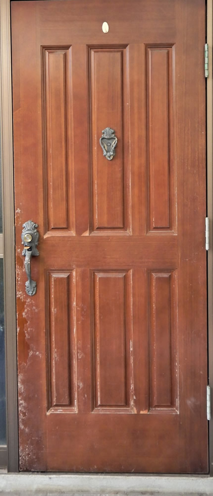 クリヤー膜の劣化が見られるヤマハ製玄関ドア。