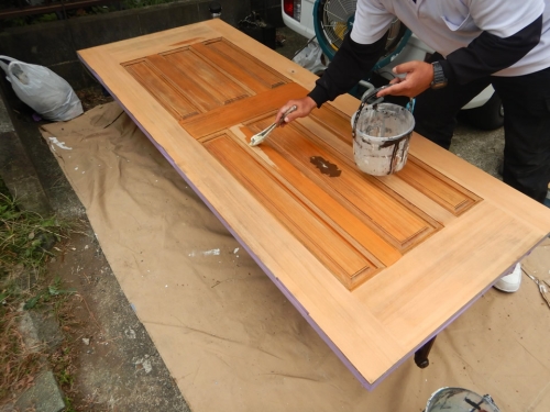剥離剤使用の全面剥離を行い、研磨、薬品による染み抜き、着色、クりヤー塗装で仕上げを行いました。