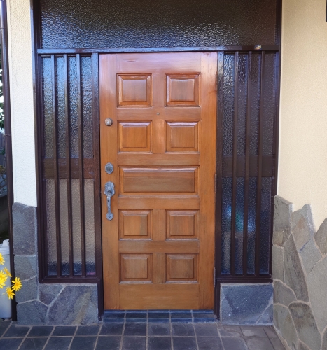 クリヤー膜の劣化、カビ、色ムラが見られる玄関ドア。