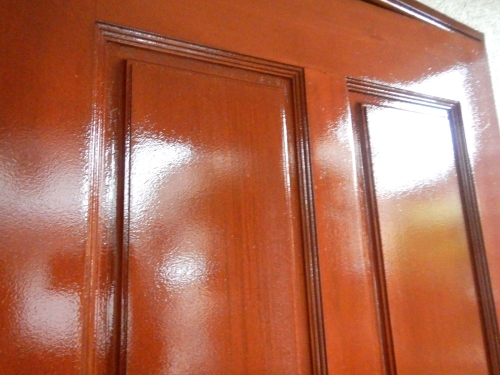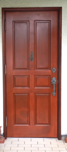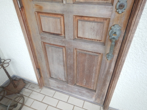 クリヤー膜の剥離、やけ、雨染み、色ムラが見られる玄関ドア。